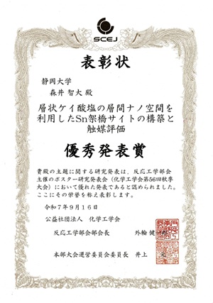 発表題目:『層状ケイ酸塩の層間ナノ空間を利用したSn架橋サイトの構築と触媒評価』