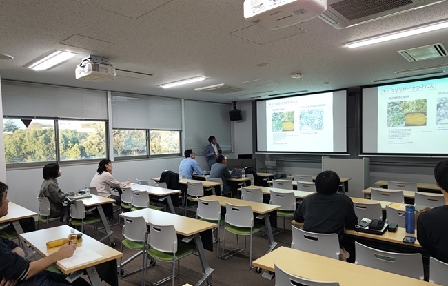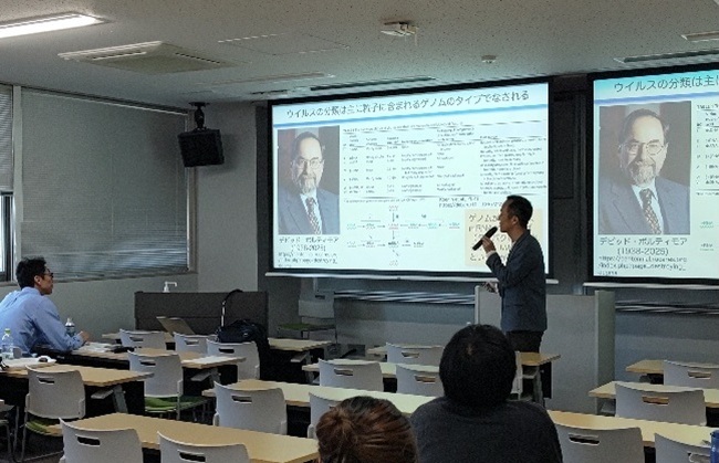 セミナーでは、初めに「オオバコから始める植物ウイルス研究 〜ウイルス感染・発病機構の理解に向けて」と題して、東京農工大学の小松 健先生にご講演いただきました。ウイルスに馴染みがない人にも理解できるよう、ウイルス学の基礎から始まり、植物ウイルス研究における課題や、これまでのキャリアで何を考えどのような研究を行ってきたかについて、落語家を思わせる軽妙な語り口で紹介されました。さらに、未発表を含む最新の研究成果についても惜しみなく披露していただき、聴衆からも多くの質問が寄せられました。特に、研究の材料としてきたウイルスの多様性や進化に着目し、フィールドで発生するウイルスの多様性や原宿主であるオオバコにおけるウイルスの生態を解明した研究を興味深く拝聴しました。また、セミナーでの話題は研究内容だけに留まらず、日々研究に取り組む学生の心構えにもおよび、「研究はめんどくさいもの」という言葉が特に印象に残りました。